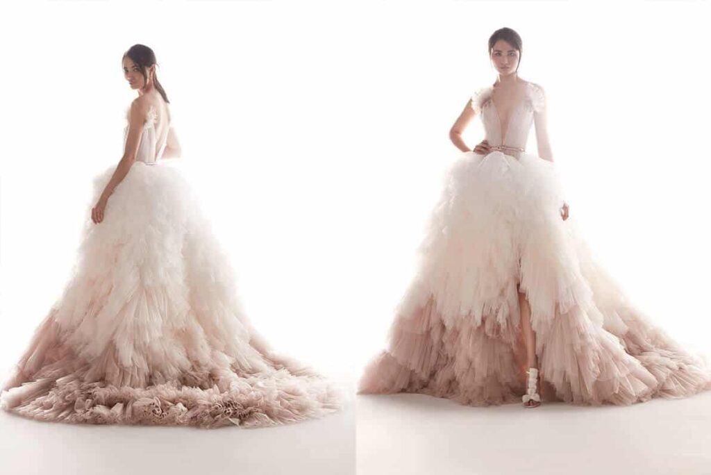 Anche quest’anno il bianco viene sostituito principalmente da toni più naturali e romantici come il cipria e il rosa antico che vanno ad impreziosire il gioco delle balze di tulle creando un effetto impalpabile, leggero e ancor più tridimensionale.